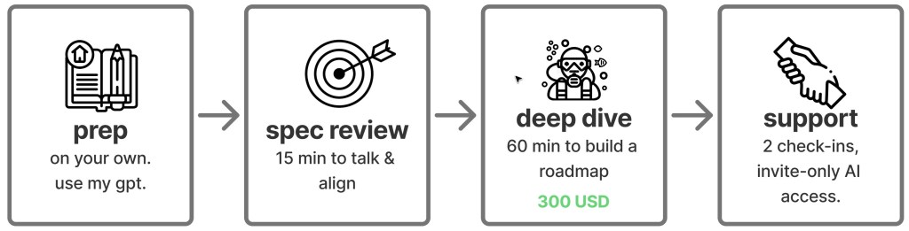 a 15-minute collaborative review of your spec sheet to see if we’re a fit. before booking, complete your spec sheet—a 5-minute exercise to clarify your goals using my career spec coach custom gpt. no spec sheet = no call. cost: free.